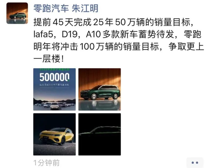 这也让零跑有了冲击更高目标的底气。财报发布前,零跑汽车创始人、董事长、CEO朱江明在朋友圈表示,2026年,零跑将冲刺百万销量新目标。