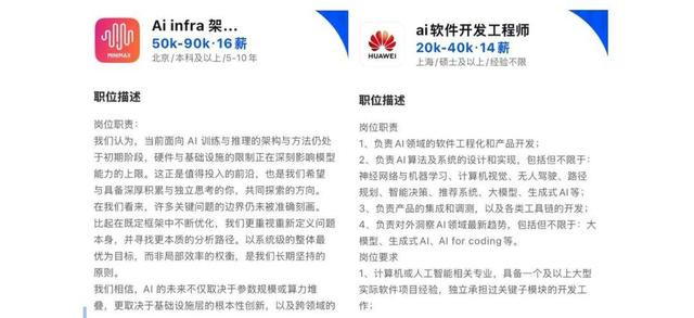 在脉脉上,华为、字节跳动等科技巨头以及MiniMax等AI领域头部企业发布了大量AI工程师相关岗位,比如AI软件开发、AI应用研发专家、AI算法工程师等,年薪最高可达140万元。2025年9月,中国AI相关新发岗位数量同比增长11倍,1000多家AI公司在脉脉上发布的AI岗位超过7.2万个,多家企业高管亲自下场招聘,HR、猎头分钟级活跃,快速捕捉AI人才动态。