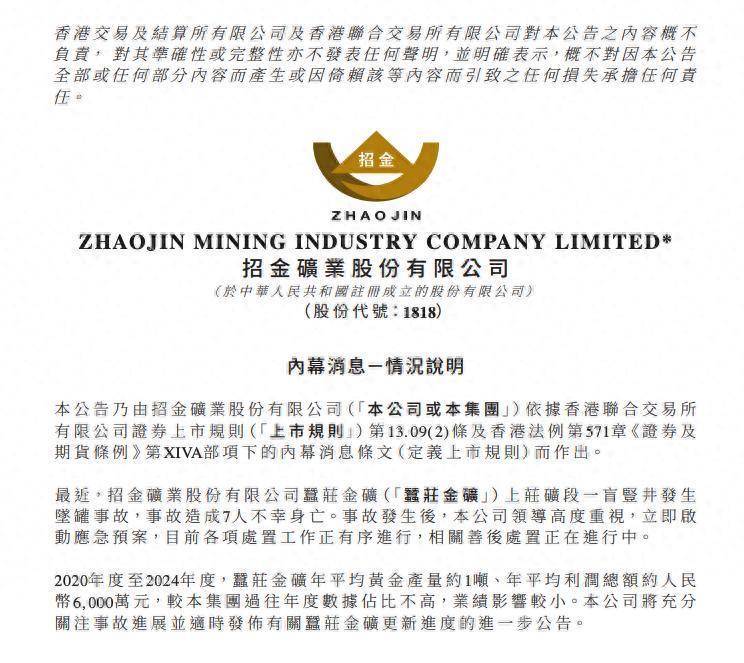招金矿业称,2020年度至2024年度,蚕庄金矿年平均黄金产量约1吨、年平均利润总额约人民币6000万元,较集团过往年度数据占比不高,业绩影响较小。公司将充分关注事故进展并适时发布有关蚕庄金矿更新进度的进一步公告。